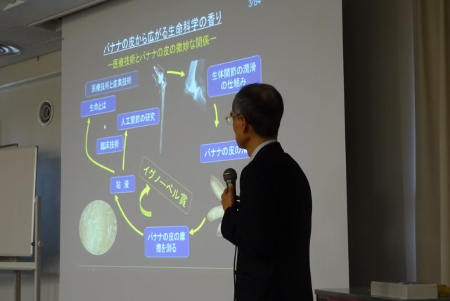 総会に引き続いて行われた特別講演では、バナナの皮はなぜ滑るのか?という論文でイグノーベル賞を受賞された、北里大学名誉教授の馬渕清資(まぶちきよし)先生をお招きして、「バナナの皮から広がる生命科学の香り」という演題でご講演頂きました。